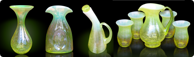 Very rare VASELINE glass in America must be yellow-green in natural light AND glow. Over the years from 1840-1999 canary/vaseline glass will vary in color intensity and hue with changes occurring about every twenty years. There are also changes from manufacturer to manufacturer and even by the same manufacturer, due to lack of quality controlBy the 1920's and 30's, some vaseline glass was being made, but the color was going out of vogue. Fostoria and Cambridge made some beautiful vaseline glass during the depression years that is true vaseline, but it looks different than what was made during 1885-1895. Fenton's 'Topaz' made during the early 1940's, again took on a different shade as did Fostoria's HEIRLOOM pattern from 1959. Today's vaseline glass is a very harsh yellow-green (when compared to the glass made in 1885), but it still uses 1-2% of uranium salts to color it. Vaseline glass has been at least called the following names during the past 160 years: CANARY, ANNAGLEB, VASELINE, CANARIA (by Pairpoint), TOPAZ (by Fenton and others), YELLOW (Fostoria Heirloom pattern), JASMINE (Duncan & Miller) and probably others. The preferred term for this interesting glass by the majority of collectors is vaseline. One can call it whatever they want, of course, but if they want others to know what they are talking about, they tend to use the word "vaseline" to be understood. Coloured glass is produced by using various metal oxides. The colours vary according to the nature and quality of the oxides, the glass mixture into which it is added, and whether or not there is a reducing or oxidizing agent present. A reducing agent removes oxygen from a chemical while an oxidizing agent adds oxygen. Cobalt oxide gives a beautiful dark blue colour, manganese a purple or black colour and manganese used in conjunction with iron and arsenic will produce many shades of amber. Ferrous oxide produces olive green or pale blue. Ferric oxide will produce a yellow colour but requires the presence of an oxidizing agent. Copper gives a peacock blue colour, which can turn green if the proportion of copper oxide is increased. Gold is used for the production of red or ruby glass. The chemist worked behind the scenes & suddenly stumbles upon the formula to produce heat sensitive glass. The addition of arsenic, uranium or gold to the batch mixture gave the molten glass the ability to change from one colour to another when reheated at the glory hole. The glassmaker controlled the precise area of the colour change by re-heating only the desired part of the glass. At the same time, it was